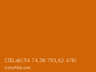 CIELab 54.74,38.793,62.478 Color is a normal orange color and the nearest color is Red Stage #d05f04. Hex code #d16404 and RGB value is rgb(209,100,4). In RGB color space, this color is composed of 82% red, 39% green, 2% blue, In CMYK color space, this color is composed of 0% cyan, 52% magenta, 98% yellow , 18% black , In HSL color space, this color has a hue angle of 28° , 96% saturation and 42% lightness.