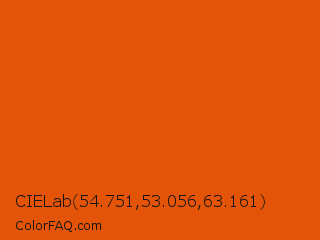 CIELab 54.751,53.056,63.161 Color is a normal orange color and the nearest color is Trinidad #e64e03. Hex code #e35408 and RGB value is rgb(227,84,8). In RGB color space, this color is composed of 89% red, 33% green, 3% blue, In CMYK color space, this color is composed of 0% cyan, 63% magenta, 96% yellow , 11% black , In HSL color space, this color has a hue angle of 21° , 93% saturation and 46% lightness.