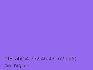 CIELab 54.752,46.43,-62.226 Color is a light indigo color and the nearest color is Navy Purple #9457eb. Hex code #9469f0 and RGB value is rgb(148,105,240). In RGB color space, this color is composed of 58% red, 41% green, 94% blue, In CMYK color space, this color is composed of 38% cyan, 56% magenta, 0% yellow , 6% black , In HSL color space, this color has a hue angle of 259° , 82% saturation and 68% lightness.