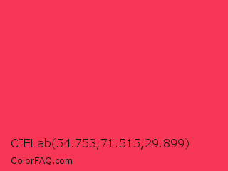 CIELab 54.753,71.515,29.899 Color is a normal red color and the nearest color is Sizzling Red #ff3855. Hex code #f53654 and RGB value is rgb(245,54,84). In RGB color space, this color is composed of 96% red, 21% green, 33% blue, In CMYK color space, this color is composed of 0% cyan, 78% magenta, 66% yellow , 4% black , In HSL color space, this color has a hue angle of 351° , 91% saturation and 59% lightness.