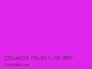 CIELab 54.756,85.1,-56.089 Color is a normal magenta color and the nearest color is Steel Pink #cc33cc. Hex code #de27e6 and RGB value is rgb(222,39,230). In RGB color space, this color is composed of 87% red, 15% green, 90% blue, In CMYK color space, this color is composed of 3% cyan, 83% magenta, 0% yellow , 10% black , In HSL color space, this color has a hue angle of 297° , 79% saturation and 53% lightness.