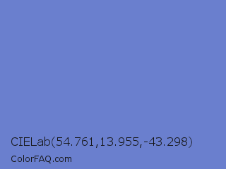 CIELab 54.761,13.955,-43.298 Color is a light blue color and the nearest color is Danube #6093d1. Hex code #6a7fce and RGB value is rgb(106,127,206). In RGB color space, this color is composed of 42% red, 50% green, 81% blue, In CMYK color space, this color is composed of 49% cyan, 38% magenta, 0% yellow , 19% black , In HSL color space, this color has a hue angle of 227° , 51% saturation and 61% lightness.