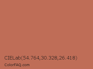 CIELab 54.764,30.328,26.418 Color is a normal red color and the nearest color is Copper Red #cb6d51. Hex code #bf6d57 and RGB value is rgb(191,109,87). In RGB color space, this color is composed of 75% red, 43% green, 34% blue, In CMYK color space, this color is composed of 0% cyan, 43% magenta, 54% yellow , 25% black , In HSL color space, this color has a hue angle of 13° , 45% saturation and 55% lightness.