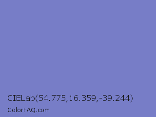 CIELab 54.775,16.359,-39.244 Color is a light blue color and the nearest color is Moody Blue #7f76d3. Hex code #777dc7 and RGB value is rgb(119,125,199). In RGB color space, this color is composed of 47% red, 49% green, 78% blue, In CMYK color space, this color is composed of 40% cyan, 37% magenta, 0% yellow , 22% black , In HSL color space, this color has a hue angle of 236° , 42% saturation and 62% lightness.