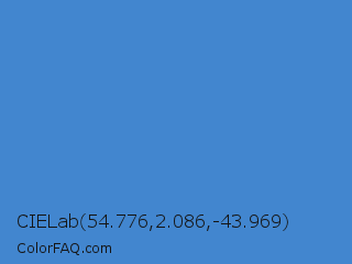 CIELab 54.776,2.086,-43.969 Color is a normal blue color and the nearest color is Cyan Blue Azure #4682bf. Hex code #4286cf and RGB value is rgb(66,134,207). In RGB color space, this color is composed of 26% red, 53% green, 81% blue, In CMYK color space, this color is composed of 68% cyan, 35% magenta, 0% yellow , 19% black , In HSL color space, this color has a hue angle of 211° , 59% saturation and 54% lightness.