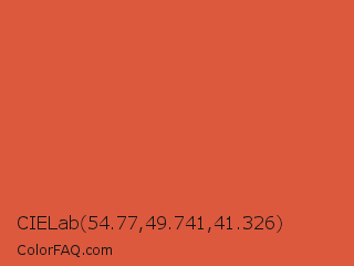 CIELab 54.77,49.741,41.326 Color is a normal red color and the nearest color is Flame Pea #da5b38. Hex code #dc593e and RGB value is rgb(220,89,62). In RGB color space, this color is composed of 86% red, 35% green, 24% blue, In CMYK color space, this color is composed of 0% cyan, 60% magenta, 72% yellow , 14% black , In HSL color space, this color has a hue angle of 10° , 69% saturation and 55% lightness.