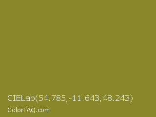 CIELab 54.785,-11.643,48.243 Color is a normal yellow color and the nearest color is Old Moss Green #867e36. Hex code #888729 and RGB value is rgb(136,135,41). In RGB color space, this color is composed of 53% red, 53% green, 16% blue, In CMYK color space, this color is composed of 0% cyan, 1% magenta, 70% yellow , 47% black , In HSL color space, this color has a hue angle of 59° , 54% saturation and 35% lightness.