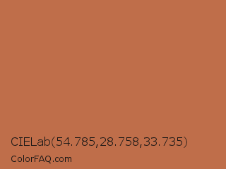 CIELab 54.785,28.758,33.735 Color is a normal orange color and the nearest color is Copper Red #cb6d51. Hex code #bf6e4a and RGB value is rgb(191,110,74). In RGB color space, this color is composed of 75% red, 43% green, 29% blue, In CMYK color space, this color is composed of 0% cyan, 42% magenta, 61% yellow , 25% black , In HSL color space, this color has a hue angle of 18° , 48% saturation and 52% lightness.
