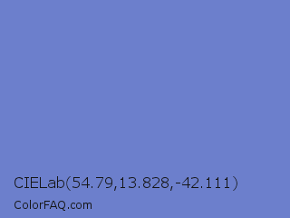 CIELab 54.79,13.828,-42.111 Color is a light blue color and the nearest color is Moody Blue #7f76d3. Hex code #6c7fcc and RGB value is rgb(108,127,204). In RGB color space, this color is composed of 42% red, 50% green, 80% blue, In CMYK color space, this color is composed of 47% cyan, 38% magenta, 0% yellow , 20% black , In HSL color space, this color has a hue angle of 228° , 48% saturation and 61% lightness.