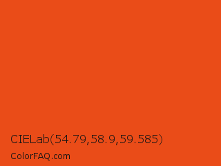 CIELab 54.79,58.9,59.585 Color is a normal color and the nearest color is Pomegranate #f34723. Hex code #ea4c18 and RGB value is rgb(234,76,24). In RGB color space, this color is composed of 92% red, 30% green, 9% blue, In CMYK color space, this color is composed of 0% cyan, 68% magenta, 90% yellow , 8% black , In HSL color space, this color has a hue angle of 15° , 83% saturation and 51% lightness.
