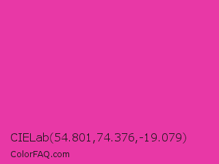 CIELab 54.801,74.376,-19.079 Color is a normal magenta color and the nearest color is Frostbite #e936a7. Hex code #e838a6 and RGB value is rgb(232,56,166). In RGB color space, this color is composed of 91% red, 22% green, 65% blue, In CMYK color space, this color is composed of 0% cyan, 76% magenta, 28% yellow , 9% black , In HSL color space, this color has a hue angle of 323° , 79% saturation and 56% lightness.