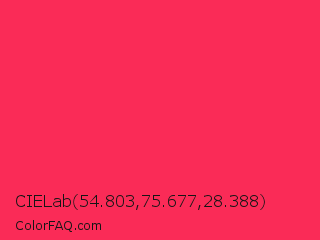 CIELab 54.803,75.677,28.388 Color is a normal red color and the nearest color is Awesome #ff2052. Hex code #fa2b57 and RGB value is rgb(250,43,87). In RGB color space, this color is composed of 98% red, 17% green, 34% blue, In CMYK color space, this color is composed of 0% cyan, 83% magenta, 65% yellow , 2% black , In HSL color space, this color has a hue angle of 347° , 95% saturation and 57% lightness.