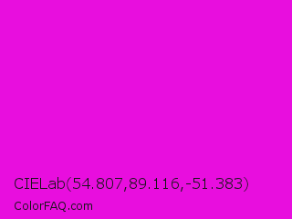 CIELab 54.807,89.116,-51.383 Color is a normal magenta color and the nearest color is Hot Magenta #ff1dce. Hex code #e80ede and RGB value is rgb(232,14,222). In RGB color space, this color is composed of 91% red, 5% green, 87% blue, In CMYK color space, this color is composed of 0% cyan, 94% magenta, 4% yellow , 9% black , In HSL color space, this color has a hue angle of 303° , 89% saturation and 48% lightness.