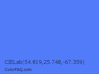 CIELab 54.819,25.748,-67.359 Color is a light blue color and the nearest color is Blueberry #4f86f7. Hex code #517bf9 and RGB value is rgb(81,123,249). In RGB color space, this color is composed of 32% red, 48% green, 98% blue, In CMYK color space, this color is composed of 67% cyan, 51% magenta, 0% yellow , 2% black , In HSL color space, this color has a hue angle of 225° , 93% saturation and 65% lightness.