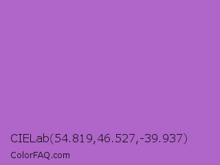 CIELab 54.819,46.527,-39.937 Color is a normal purple color and the nearest color is Rich Lilac #b666d2. Hex code #b065c9 and RGB value is rgb(176,101,201). In RGB color space, this color is composed of 69% red, 40% green, 79% blue, In CMYK color space, this color is composed of 12% cyan, 50% magenta, 0% yellow , 21% black , In HSL color space, this color has a hue angle of 285° , 48% saturation and 59% lightness.