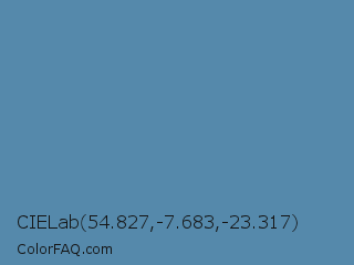 CIELab 54.827,-7.683,-23.317 Color is a normal blue color and the nearest color is Air Force Blue RAF #5d8aa8. Hex code #5589ab and RGB value is rgb(85,137,171). In RGB color space, this color is composed of 33% red, 54% green, 67% blue, In CMYK color space, this color is composed of 50% cyan, 20% magenta, 0% yellow , 33% black , In HSL color space, this color has a hue angle of 204° , 34% saturation and 50% lightness.