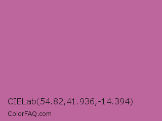 CIELab 54.82,41.936,-14.394 Color is a normal magenta color and the nearest color is Pearly Purple #b768a2. Hex code #bd669d and RGB value is rgb(189,102,157). In RGB color space, this color is composed of 74% red, 40% green, 62% blue, In CMYK color space, this color is composed of 0% cyan, 46% magenta, 17% yellow , 26% black , In HSL color space, this color has a hue angle of 322° , 40% saturation and 57% lightness.