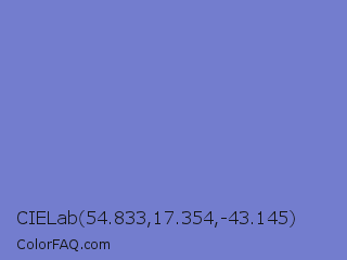 CIELab 54.833,17.354,-43.145 Color is a light blue color and the nearest color is Moody Blue #7f76d3. Hex code #737dce and RGB value is rgb(115,125,206). In RGB color space, this color is composed of 45% red, 49% green, 81% blue, In CMYK color space, this color is composed of 44% cyan, 39% magenta, 0% yellow , 19% black , In HSL color space, this color has a hue angle of 233° , 48% saturation and 63% lightness.