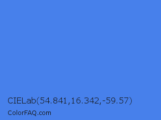 CIELab 54.841,16.342,-59.57 Color is a normal blue color and the nearest color is Blueberry #4f86f7. Hex code #4780eb and RGB value is rgb(71,128,235). In RGB color space, this color is composed of 28% red, 50% green, 92% blue, In CMYK color space, this color is composed of 70% cyan, 46% magenta, 0% yellow , 8% black , In HSL color space, this color has a hue angle of 219° , 80% saturation and 60% lightness.