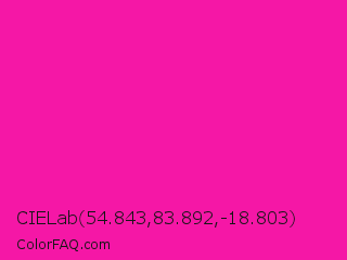CIELab 54.843,83.892,-18.803 Color is a normal magenta color and the nearest color is Persian Rose #fe28a2. Hex code #f517a6 and RGB value is rgb(245,23,166). In RGB color space, this color is composed of 96% red, 9% green, 65% blue, In CMYK color space, this color is composed of 0% cyan, 91% magenta, 32% yellow , 4% black , In HSL color space, this color has a hue angle of 321° , 92% saturation and 53% lightness.
