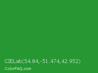 CIELab 54.84,-51.474,42.952 Color is a normal green color and the nearest color is Forest Green #228b22. Hex code #269732 and RGB value is rgb(38,151,50). In RGB color space, this color is composed of 15% red, 59% green, 20% blue, In CMYK color space, this color is composed of 75% cyan, 0% magenta, 67% yellow , 41% black , In HSL color space, this color has a hue angle of 126° , 60% saturation and 37% lightness.