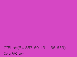 CIELab 54.853,69.131,-36.653 Color is a normal magenta color and the nearest color is Steel Pink #cc33cc. Hex code #d647c4 and RGB value is rgb(214,71,196). In RGB color space, this color is composed of 84% red, 28% green, 77% blue, In CMYK color space, this color is composed of 0% cyan, 67% magenta, 8% yellow , 16% black , In HSL color space, this color has a hue angle of 308° , 64% saturation and 56% lightness.
