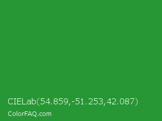 CIELab 54.859,-51.253,42.087 Color is a normal green color and the nearest color is Forest Green #228b22. Hex code #269734 and RGB value is rgb(38,151,52). In RGB color space, this color is composed of 15% red, 59% green, 20% blue, In CMYK color space, this color is composed of 75% cyan, 0% magenta, 66% yellow , 41% black , In HSL color space, this color has a hue angle of 127° , 60% saturation and 37% lightness.