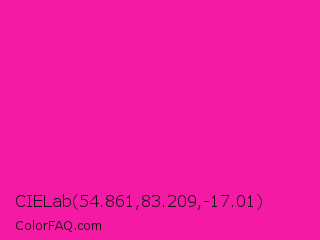 CIELab 54.861,83.209,-17.01 Color is a normal magenta color and the nearest color is Persian Rose #fe28a2. Hex code #f51aa3 and RGB value is rgb(245,26,163). In RGB color space, this color is composed of 96% red, 10% green, 64% blue, In CMYK color space, this color is composed of 0% cyan, 89% magenta, 33% yellow , 4% black , In HSL color space, this color has a hue angle of 322° , 92% saturation and 53% lightness.