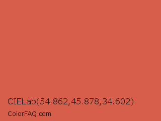 CIELab 54.862,45.878,34.602 Color is a normal red color and the nearest color is Jelly Bean #da614e. Hex code #d65e4a and RGB value is rgb(214,94,74). In RGB color space, this color is composed of 84% red, 37% green, 29% blue, In CMYK color space, this color is composed of 0% cyan, 56% magenta, 65% yellow , 16% black , In HSL color space, this color has a hue angle of 9° , 63% saturation and 56% lightness.