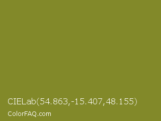 CIELab 54.863,-15.407,48.155 Color is a normal yellow color and the nearest color is Wasabi #788a25. Hex code #828929 and RGB value is rgb(130,137,41). In RGB color space, this color is composed of 51% red, 54% green, 16% blue, In CMYK color space, this color is composed of 5% cyan, 0% magenta, 70% yellow , 46% black , In HSL color space, this color has a hue angle of 64° , 54% saturation and 35% lightness.