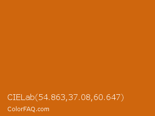 CIELab 54.863,37.08,60.647 Color is a normal orange color and the nearest color is Red Stage #d05f04. Hex code #cf660d and RGB value is rgb(207,102,13). In RGB color space, this color is composed of 81% red, 40% green, 5% blue, In CMYK color space, this color is composed of 0% cyan, 51% magenta, 94% yellow , 19% black , In HSL color space, this color has a hue angle of 28° , 88% saturation and 43% lightness.