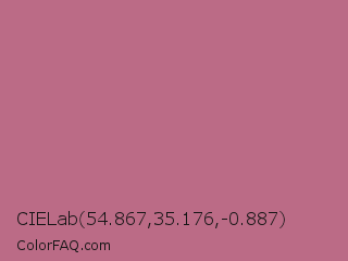 CIELab 54.867,35.176,-0.887 Color is a normal rose color and the nearest color is Turkish Rose #b57281. Hex code #bb6b86 and RGB value is rgb(187,107,134). In RGB color space, this color is composed of 73% red, 42% green, 53% blue, In CMYK color space, this color is composed of 0% cyan, 43% magenta, 28% yellow , 27% black , In HSL color space, this color has a hue angle of 340° , 37% saturation and 58% lightness.