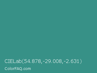 CIELab 54.878,-29.008,-2.631 Color is a normal cyan color and the nearest color is Lochinvar #2c8c84. Hex code #379187 and RGB value is rgb(55,145,135). In RGB color space, this color is composed of 22% red, 57% green, 53% blue, In CMYK color space, this color is composed of 62% cyan, 0% magenta, 7% yellow , 43% black , In HSL color space, this color has a hue angle of 173° , 45% saturation and 39% lightness.