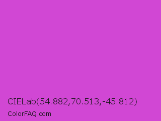 CIELab 54.882,70.513,-45.812 Color is a normal magenta color and the nearest color is Steel Pink #cc33cc. Hex code #d147d4 and RGB value is rgb(209,71,212). In RGB color space, this color is composed of 82% red, 28% green, 83% blue, In CMYK color space, this color is composed of 1% cyan, 67% magenta, 0% yellow , 17% black , In HSL color space, this color has a hue angle of 299° , 62% saturation and 55% lightness.