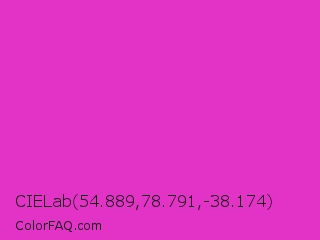 CIELab 54.889,78.791,-38.174 Color is a normal magenta color and the nearest color is Steel Pink #cc33cc. Hex code #e333c7 and RGB value is rgb(227,51,199). In RGB color space, this color is composed of 89% red, 20% green, 78% blue, In CMYK color space, this color is composed of 0% cyan, 78% magenta, 12% yellow , 11% black , In HSL color space, this color has a hue angle of 310° , 76% saturation and 55% lightness.
