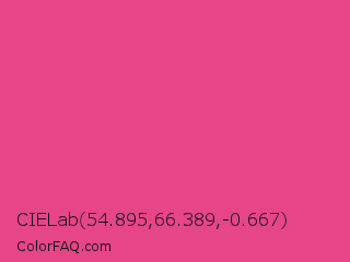CIELab 54.895,66.389,-0.667 Color is a normal rose color and the nearest color is Cerise Pink #ec3b83. Hex code #e64587 and RGB value is rgb(230,69,135). In RGB color space, this color is composed of 90% red, 27% green, 53% blue, In CMYK color space, this color is composed of 0% cyan, 70% magenta, 41% yellow , 10% black , In HSL color space, this color has a hue angle of 335° , 76% saturation and 59% lightness.