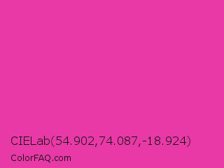 CIELab 54.902,74.087,-18.924 Color is a normal magenta color and the nearest color is Frostbite #e936a7. Hex code #e839a6 and RGB value is rgb(232,57,166). In RGB color space, this color is composed of 91% red, 22% green, 65% blue, In CMYK color space, this color is composed of 0% cyan, 75% magenta, 28% yellow , 9% black , In HSL color space, this color has a hue angle of 323° , 79% saturation and 57% lightness.