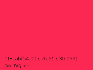CIELab 54.905,76.615,30.963 Color is a normal red color and the nearest color is Awesome #ff2052. Hex code #fc2853 and RGB value is rgb(252,40,83). In RGB color space, this color is composed of 99% red, 16% green, 33% blue, In CMYK color space, this color is composed of 0% cyan, 84% magenta, 67% yellow , 1% black , In HSL color space, this color has a hue angle of 348° , 97% saturation and 57% lightness.