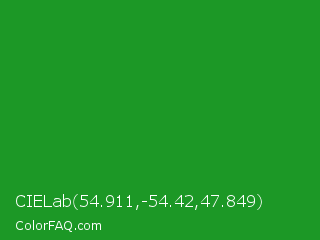 CIELab 54.911,-54.42,47.849 Color is a normal green color and the nearest color is Forest Green #228b22. Hex code #1c9826 and RGB value is rgb(28,152,38). In RGB color space, this color is composed of 11% red, 60% green, 15% blue, In CMYK color space, this color is composed of 82% cyan, 0% magenta, 75% yellow , 40% black , In HSL color space, this color has a hue angle of 125° , 69% saturation and 35% lightness.