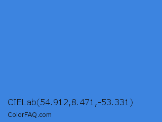 CIELab 54.912,8.471,-53.331 Color is a normal blue color and the nearest color is Tufts Blue #3e8ede. Hex code #3c84e0 and RGB value is rgb(60,132,224). In RGB color space, this color is composed of 24% red, 52% green, 88% blue, In CMYK color space, this color is composed of 73% cyan, 41% magenta, 0% yellow , 12% black , In HSL color space, this color has a hue angle of 214° , 73% saturation and 56% lightness.