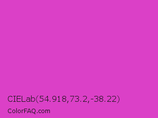 CIELab 54.918,73.2,-38.22 Color is a normal magenta color and the nearest color is Steel Pink #cc33cc. Hex code #db40c7 and RGB value is rgb(219,64,199). In RGB color space, this color is composed of 86% red, 25% green, 78% blue, In CMYK color space, this color is composed of 0% cyan, 71% magenta, 9% yellow , 14% black , In HSL color space, this color has a hue angle of 308° , 68% saturation and 55% lightness.