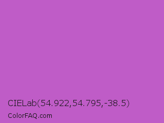 CIELab 54.922,54.795,-38.5 Color is a normal magenta color and the nearest color is Fuchsia Pink #c154c1. Hex code #bf5cc7 and RGB value is rgb(191,92,199). In RGB color space, this color is composed of 75% red, 36% green, 78% blue, In CMYK color space, this color is composed of 4% cyan, 54% magenta, 0% yellow , 22% black , In HSL color space, this color has a hue angle of 296° , 49% saturation and 57% lightness.