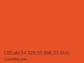 CIELab 54.929,55.896,53.016 Color is a normal red color and the nearest color is Flame #e25822. Hex code #e65128 and RGB value is rgb(230,81,40). In RGB color space, this color is composed of 90% red, 32% green, 16% blue, In CMYK color space, this color is composed of 0% cyan, 65% magenta, 83% yellow , 10% black , In HSL color space, this color has a hue angle of 13° , 79% saturation and 53% lightness.