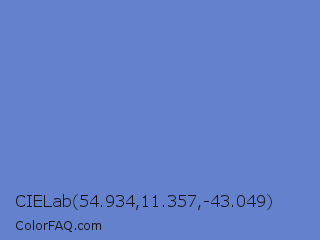CIELab 54.934,11.357,-43.049 Color is a normal blue color and the nearest color is Danube #6093d1. Hex code #6481ce and RGB value is rgb(100,129,206). In RGB color space, this color is composed of 39% red, 51% green, 81% blue, In CMYK color space, this color is composed of 51% cyan, 37% magenta, 0% yellow , 19% black , In HSL color space, this color has a hue angle of 224° , 52% saturation and 60% lightness.