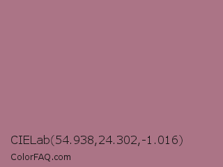 CIELab 54.938,24.302,-1.016 Color is a normal rose color and the nearest color is Turkish Rose #b57281. Hex code #ab7486 and RGB value is rgb(171,116,134). In RGB color space, this color is composed of 67% red, 45% green, 53% blue, In CMYK color space, this color is composed of 0% cyan, 32% magenta, 22% yellow , 33% black , In HSL color space, this color has a hue angle of 340° , 25% saturation and 56% lightness.
