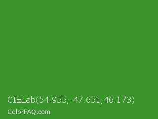 CIELab 54.955,-47.651,46.173 Color is a normal green color and the nearest color is La Palma #368716. Hex code #3a962b and RGB value is rgb(58,150,43). In RGB color space, this color is composed of 23% red, 59% green, 17% blue, In CMYK color space, this color is composed of 61% cyan, 0% magenta, 71% yellow , 41% black , In HSL color space, this color has a hue angle of 112° , 55% saturation and 38% lightness.