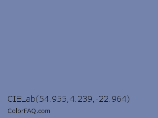 CIELab 54.955,4.239,-22.964 Color is a normal blue color and the nearest color is Shadow Blue #778ba5. Hex code #7483ab and RGB value is rgb(116,131,171). In RGB color space, this color is composed of 45% red, 51% green, 67% blue, In CMYK color space, this color is composed of 32% cyan, 23% magenta, 0% yellow , 33% black , In HSL color space, this color has a hue angle of 224° , 25% saturation and 56% lightness.
