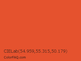 CIELab 54.959,55.315,50.179 Color is a normal red color and the nearest color is Flame #e25822. Hex code #e5522e and RGB value is rgb(229,82,46). In RGB color space, this color is composed of 90% red, 32% green, 18% blue, In CMYK color space, this color is composed of 0% cyan, 64% magenta, 80% yellow , 10% black , In HSL color space, this color has a hue angle of 12° , 78% saturation and 54% lightness.