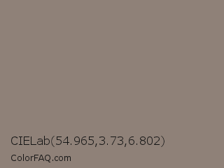 CIELab 54.965,3.73,6.802 Color is a normal orange color and the nearest color is Squirrel #8f8176. Hex code #8f8178 and RGB value is rgb(143,129,120). In RGB color space, this color is composed of 56% red, 51% green, 47% blue, In CMYK color space, this color is composed of 0% cyan, 10% magenta, 16% yellow , 44% black , In HSL color space, this color has a hue angle of 23° , 9% saturation and 52% lightness.