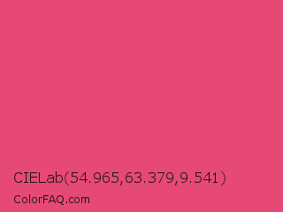 CIELab 54.965,63.379,9.541 Color is a normal rose color and the nearest color is Cranberry #db5079. Hex code #e64976 and RGB value is rgb(230,73,118). In RGB color space, this color is composed of 90% red, 29% green, 46% blue, In CMYK color space, this color is composed of 0% cyan, 68% magenta, 49% yellow , 10% black , In HSL color space, this color has a hue angle of 343° , 76% saturation and 59% lightness.